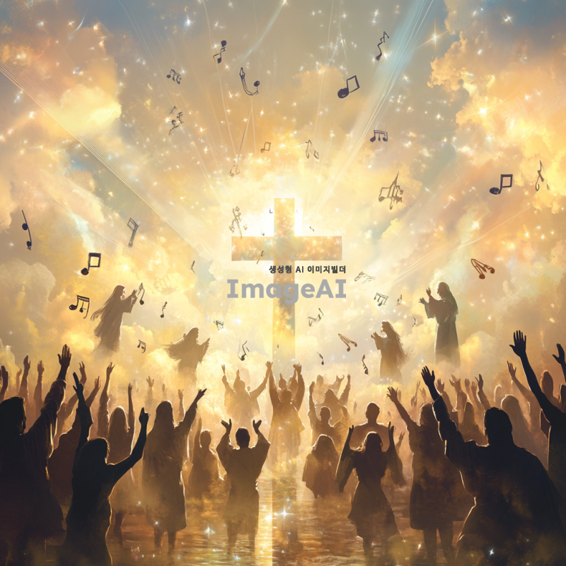 성가대 악보 표지를 위한 디자인,중앙에는 십자가를 둘러싸며 찬양을 하는 성도들,공중에 음표가 날아다니는 그림,전체적인 분위기는 천국 분위기