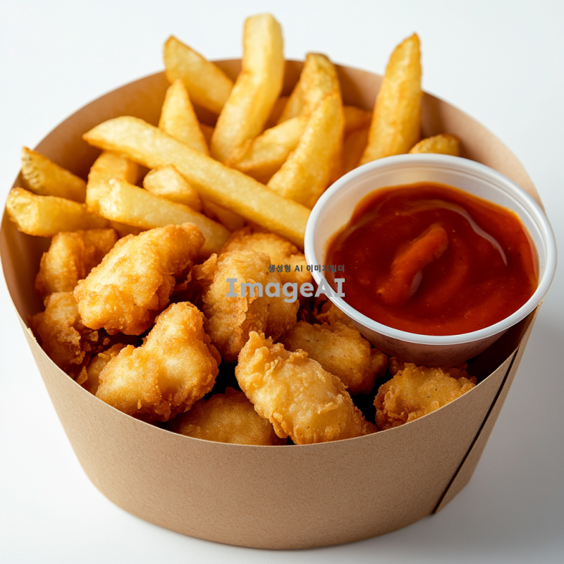 종이그릇 안에 바삭한 감자튀김, 고소한 튀김만두, 그리고 바삭하게 튀겨진 치킨너겟이 가득 담겨 있는 장면을 그려줘. 그릇은 자연스러운 하얀색으로, 음식들은 황금빛으로 빛나고, 주변에는 간단한 소스와 함께 맛있게 플레이팅된 모습이 담겨 있어야 해. 배경은 하얀색으로.