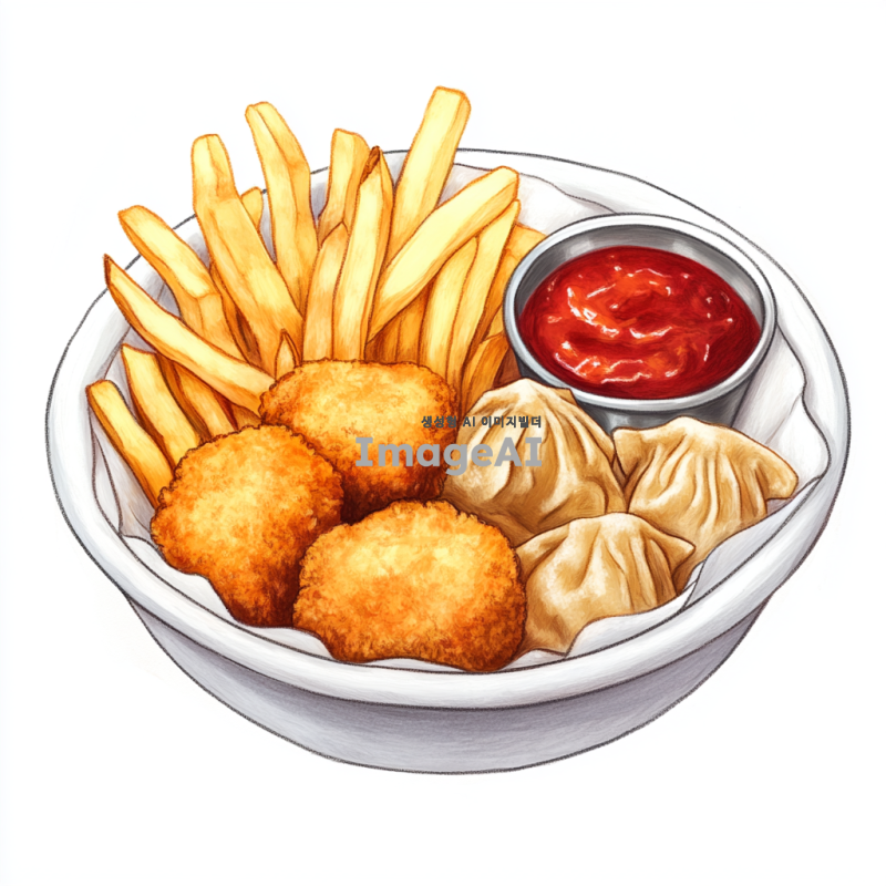 하얀 종이그릇 안에 담긴 바삭한 감자튀김, 노릇노릇한 용가리 치킨너겟, 그리고 맛있게 튀겨진 만두가 조화롭게 어우러져 있는 풍경을 그려줘. 배경은 하얀색, 음식의 색감이 돋보이도록 해줘.