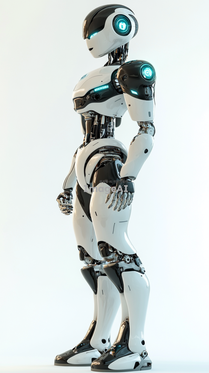 로봇이 발과 다리가 잘 보이도록 서 있는 모습, 현대적인 디자인과 세련된 외관, 메탈릭한 색감,