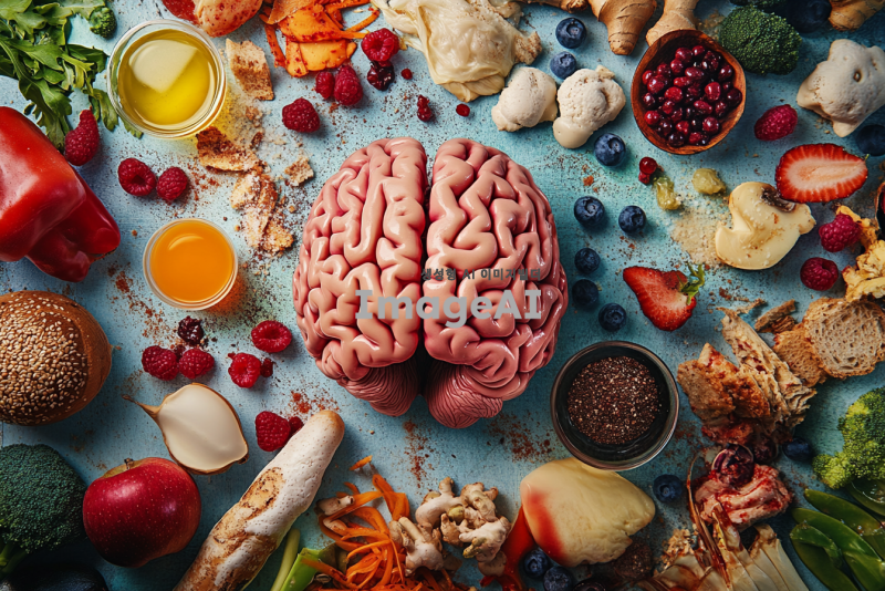 음식을 잔뜩 먹고 행복감에 가득 찬 한국인의 뇌 사진, 뇌의 여러 부분이 밝고 생동감 있게 표현되며, 도파민이 넘쳐 흐르는 느낌을 주는 색감과 질감으로 가득 찬 이미지, 뇌 주변에는 다양한 음식들이 흩어져 있어 즐거운 분위기를 연출하는 장면.