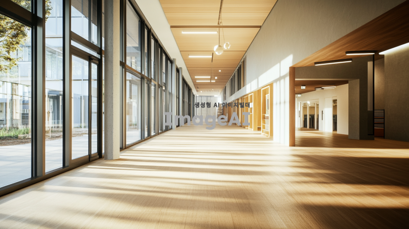 텅 빈 학교 복도의 모습, 현대적인 디자인과 따뜻한 조명,바닥은 나무 재질로 되어 있으며, 창문을 통해 자연광이 들어오고, 복도 끝에는 교실이 보이는 풍경.