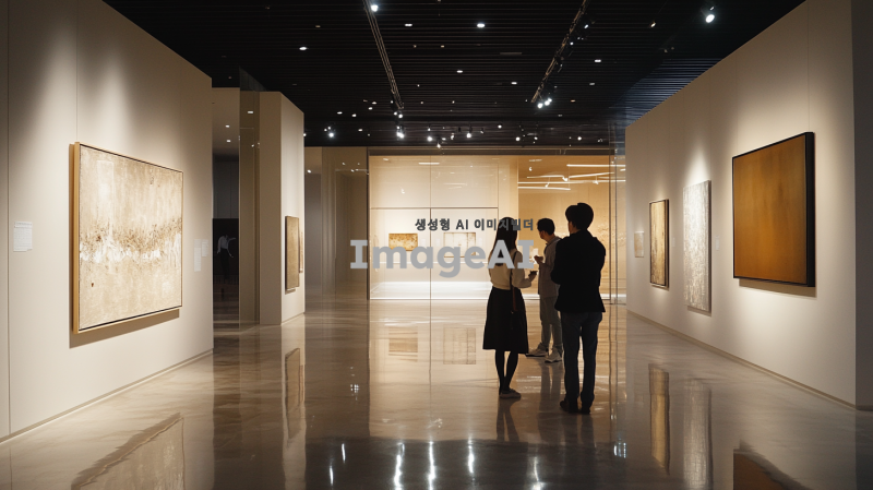 우아하고 현대적인 갤러리 전시회장 내부, 고급스러운 조명과 세련된 벽면, 다양한 예술 작품이 전시되어 있는 공간, 관람객들이 작품을 감상하며 대화하는 모습, 현대 미술의 느낌을 강조한 디자인, 한국적인 요소가 섞인 모던한 분위기.
