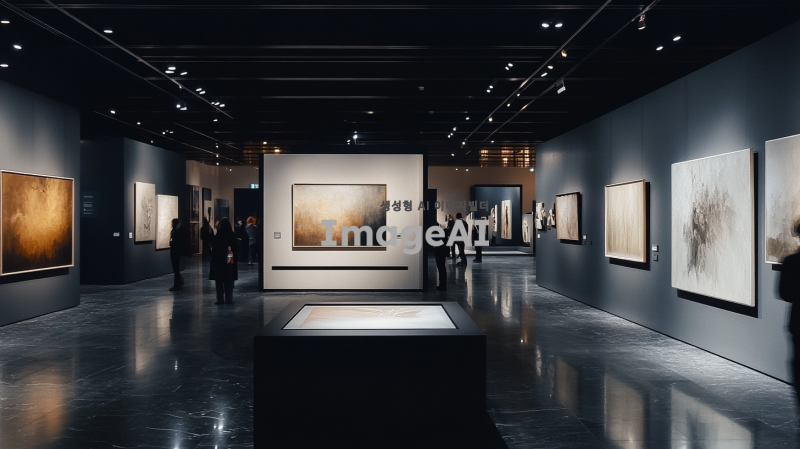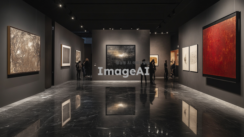 어두운 분위기의 모던한 갤러리 내부, 고급스러운 조명 아래 다양한 현대 미술 작품들이 전시되어 있는 모습, 벽은 깊은 회색 톤으로 칠해져 있으며, 바닥은 매끄러운 검은색 대리석, 관람객들이 작품을 감상하고 있는 모습, 전체적으로 세련되고 미니멀한 디자인의 공간, 미술 작품의 색감이 강조되는 조명 효과.