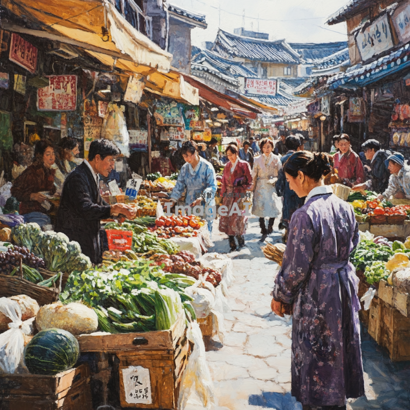 한국의 전통 시장에서 활기차게 장을 보는 사람들, 다양한 신선한 채소와 과일이 진열된 상점들, 상인과 고객 간의 따뜻한 소통, 햇살이 비치는 시장 풍경, 생동감 넘치는 색감과 분위기, 한국 전통 의상을 입은 사람들, 문화적 요소가 잘 드러나는 장면.