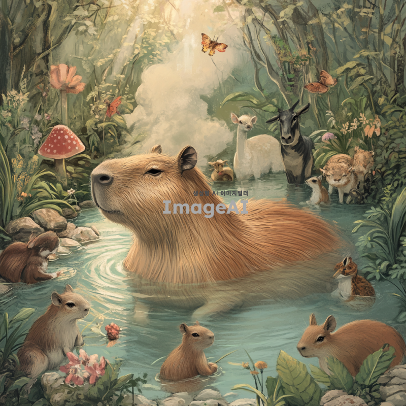 온천에 담가진 암컷 카피바라가 다양한 동물들과 함께 있는 모습, 주변에는 따뜻한 증기가 피어오르고, 카피바라와 동물들이 서로 친근하게 교감하는 장면, 자연의 아름다움이 배경으로 펼쳐진 따뜻하고 아늑한 분위기.