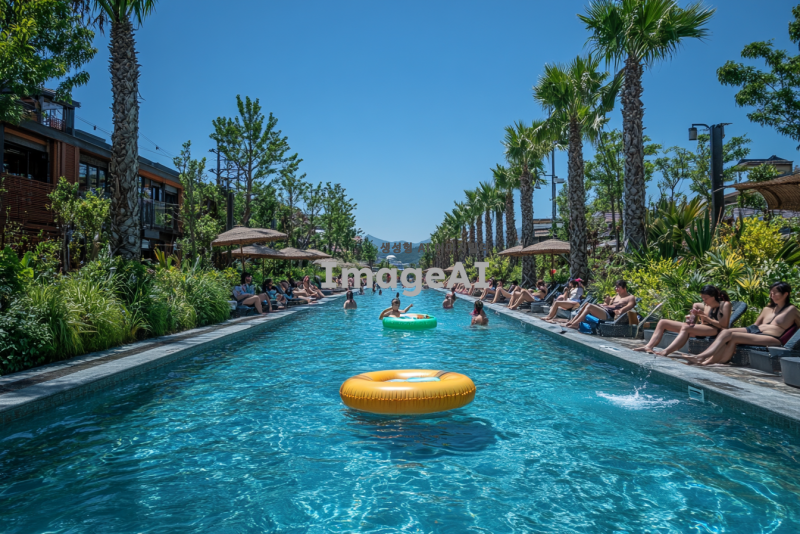 한국의 리조트 수영장에서 여유롭게 휴식하는 사람들, 푸른 하늘과 햇살이 가득한 날씨, 수영장 주변에 열대 식물과 야자수가 어우러진 풍경, 수영장에 떠 있는 튜브와 물놀이를 즐기는 아이들, 수영장 옆에는 시원한 음료를 즐기는 사람들이 있는 모습.