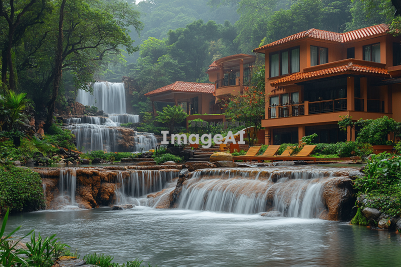 리조트 전경이야. 울창한 숲과 절벽 사이로 흐르는 폭포가 특징이야.