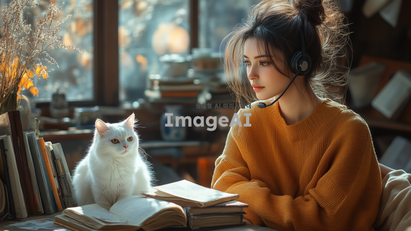 "헤드셋을 쓴 아름다운 여성이 카리나를 닮은 얼굴로, 청순하면서도 우아하고 세련된 분위기를 풍깁니다. 그녀는 따뜻한 조명과 새벽의 고요한 분위기가 느껴지는 아늑한 방에 앉아 있습니다. 방은 책, 램프, 그리고 희미한 새벽빛이 들어오는 창문과 같은 섬세한 장식 요소들로 부드럽게 꾸며져 있습니다. 그녀 옆에는 귀여운 흰 고양이가 탁자나 의자 위에 앉아 있어 장면에 매력을 더합니다. 전체적인 장면은 조화롭고 평화로운 분위기를 담고 있습니다."