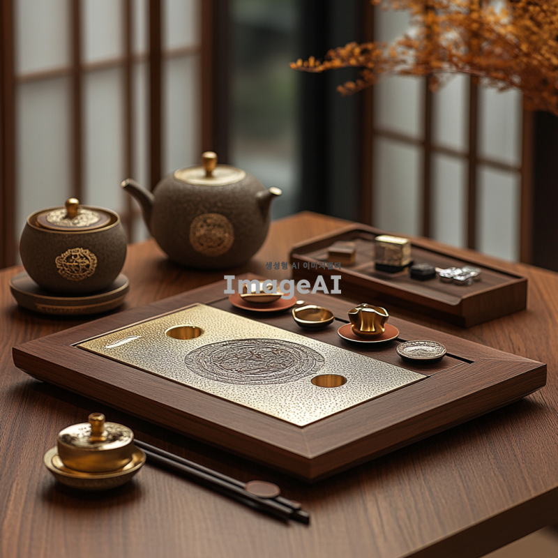 고급스러운 투병한 윷놀이 세트를 배경으로, 정교하게 디자인된 윷과 말, 고급스러운 나무 재질의 판, 섬세한 패턴이 새겨진 소품들이 조화롭게 배열된 모습. 따뜻한 조명 아래에서 우아하게 빛나는 세트의 전체적인 분위기를 강조하며, 전통적인 한국의 윷놀이 요소와 현대적인 감각이 어우러진 모습.