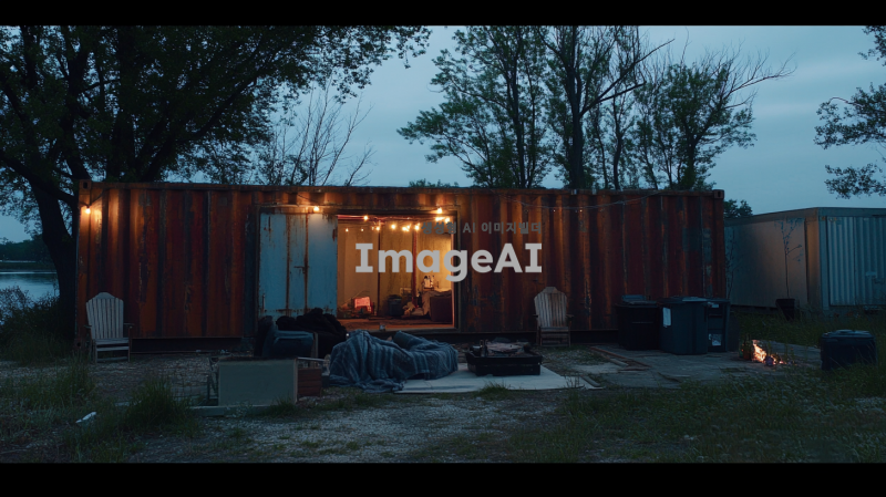 호숫가 근처에 위치한 녹슬고 낡은 큰 컨테이너, 사람의 손길이 닿아 있는 흔적이 보이는 장면. 컨테이너 앞에는 앉을 수 있는 의자와 담요가 놓여 있으며, 불을 피운 흔적이 남아 있다. 조명이 설치되어 있어 아늑한 분위기를 만들어내며, 무언가를 할 수 있는 공간이 마련되어 있다. 전체적으로 험블한 느낌의 아늑한 공간을 표현한다.