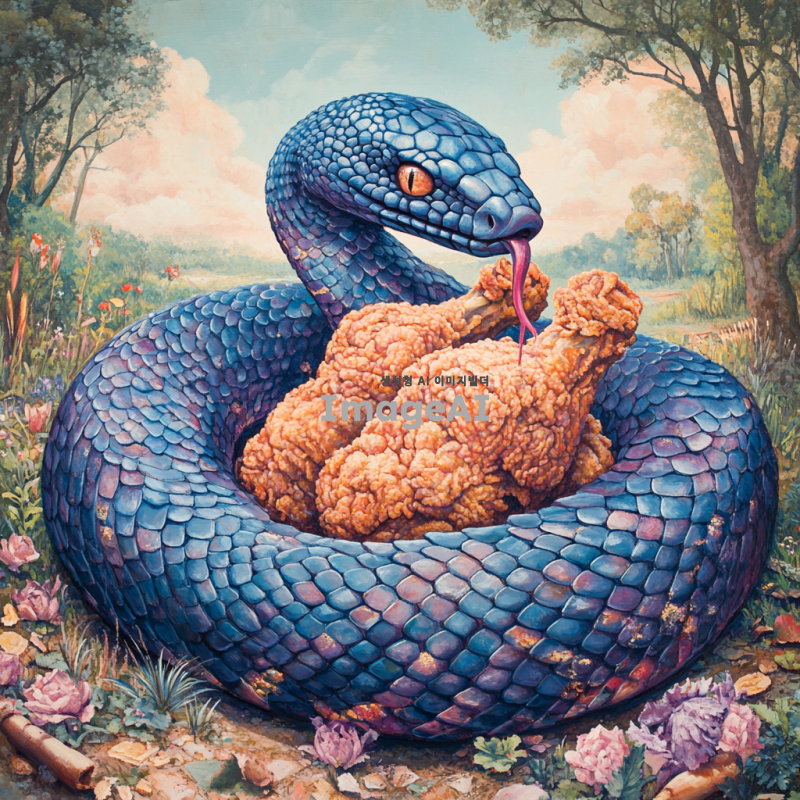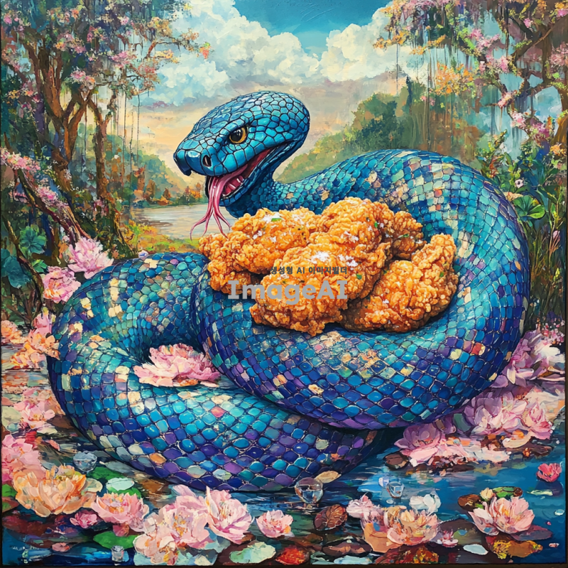 푸른 뱀이 프라이드 치킨을 감싸고 있는 모습, 뱀의 비늘이 반짝이며 생동감 넘치는 색상으로 표현되고, 치킨은 바삭하고 맛있어 보이는 디테일로 묘사됨. 배경은 자연의 풍경으로, 뱀과 치킨이 조화롭게 어우러진 장면을 그려냄.