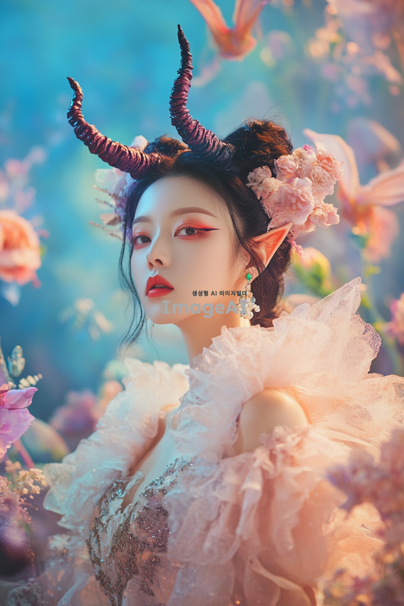 초현실적인 공주나라의 배경 속에서, 화려한 드레스를 입고 있는 한국인 여성, 그녀의 얼굴은 독특한 악마 메이크업으로 장식되어 있으며, 뾰족한 귀와 화려한 색상의 눈화장이 특징적이다. 주변에는 환상적인 꽃과 기이한 생물들이 어우러져 있고, 하늘은 오묘한 색조로 물들어 있다. 전체적인 분위기는 몽환적이고 신비로운 느낌을 주며, 마법적인 요소들이 가득한 장면을 연출한다.