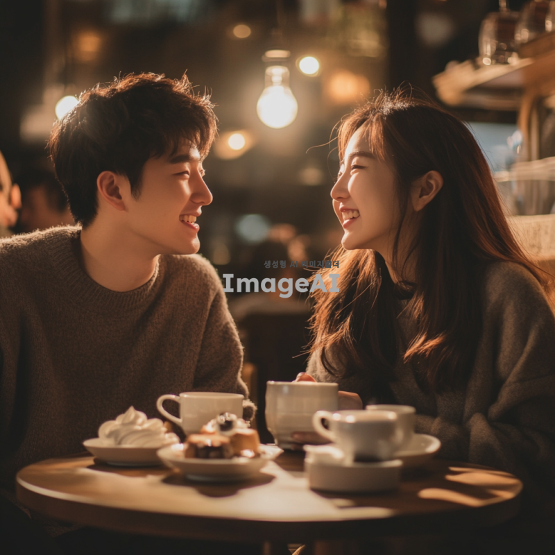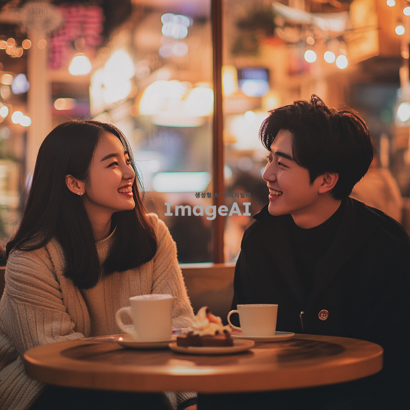 따뜻한 분위기의 카페에서 서로 이야기를 나누고 있는 한국인 친구들, 서로의 눈을 바라보며 웃고 있는 모습, 테이블 위에는 커피와 디저트가 놓여 있고, 주변에는 아늑한 조명이 비치고 있는 장면, 진정한 인간적 연결을 상징하는 따뜻한 감정이 느껴지는 이미지.