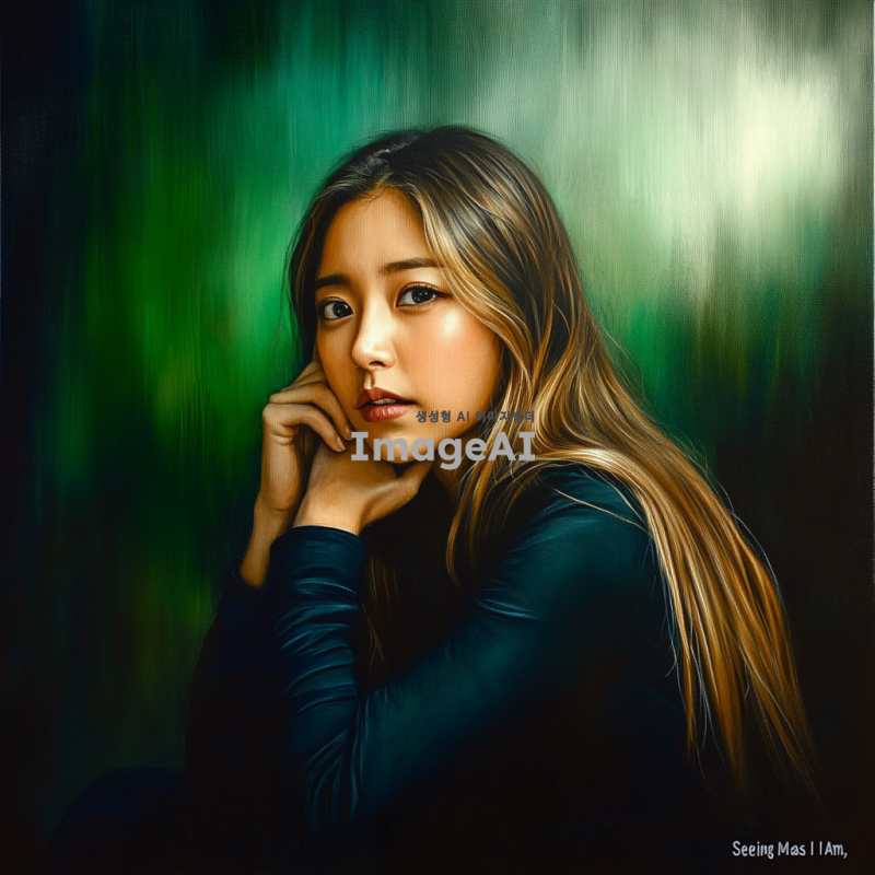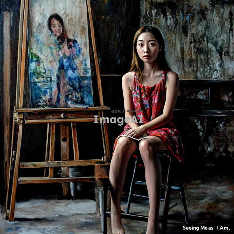 사유에 잠긴 한국 여성의 모습, 부드러운 자연광이 비치는 배경, 깊은 생각에 잠긴 표정, 책의 제목 '있는 그대로 나를 바라보기'가 잘 어울리는 편안한 분위기, 따뜻한 색감으로 감성적인 느낌을 강조한 그림.