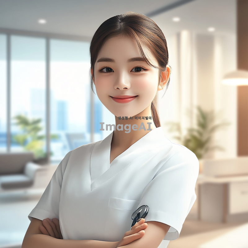 한국의 병원에서 일하는 간호사 캐릭터, 밝은 미소를 지닌 젊은 여성, 흰색 간호복과 스크럽을 입고, 의료 도구를 손에 들고 있는 모습, 배경에는 병원 내부가 보이고, 환자를 돌보는 따뜻한 분위기, 친근하고 전문적인 느낌, 자연광이 들어오는 창문이 있는 공간.