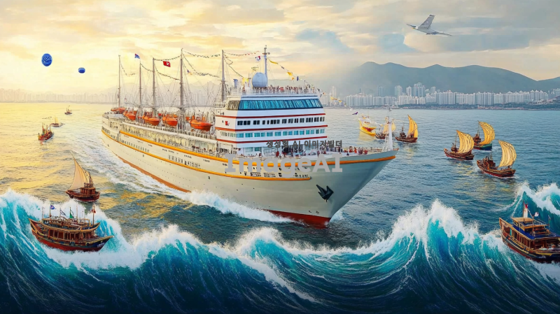 큰 배가 파도에 흔들리지 않고 안정적으로 떠 있는 모습과 그 주위에서 파도에 흔들리는 작은 배들이 함께 있는 장면을 그려주세요. 배들은 모두 한국의 전통적인 디자인 요소를 포함하고, 배경에는 푸른 바다와 하늘이 어우러진 풍경을 추가해 주세요. 큰 파도를 표현해주세요