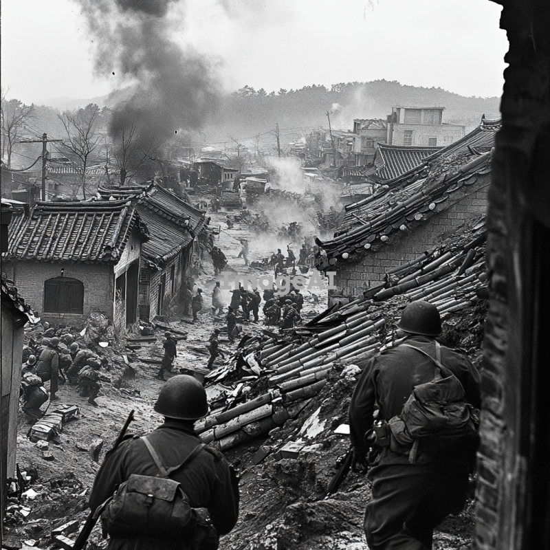 1950년대 한국 전쟁의 전투 장면, 한국군과 유엔군이 협력하여 전투하는 모습, 포화 속에서의 긴장감, 전쟁의 참상과 희생, 전통적인 한국 건축물 배경, 흑백 사진 스타일, 고전적인 느낌, 역사적 사실성을 강조한 장면.