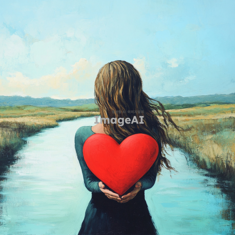 고요한 강 위에 빨간색 하트가 떠다니고 있는 장면. 하트를 들고 있는 웨이브 파마 긴 머리의 여자의 뒷모습으로 보인다. 배경은 잔잔한 물결과 푸른 하늘이 어우러진 평화로운 풍경.