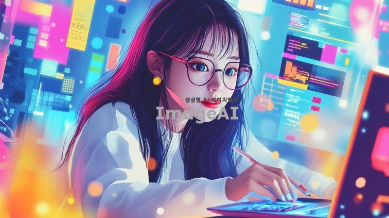 버추얼 크리에이터 매니저 포트폴리오 표지 디자인, 현대적이고 세련된 느낌, 한국인 여성 캐릭터가 디지털 기기를 사용하며 창의적으로 작업하는 모습, 배경은 화려한 그래픽과 컬러풀한 요소들로 구성, 전문성과 혁신성을 강조하는 스타일, 포트폴리오 제목이 잘 보이도록 디자인, 전체적으로 밝고 긍정적인 분위기.