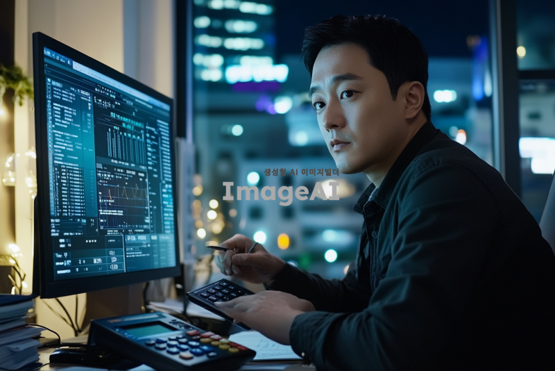 연말정산을 위한 세금 절세 계산기를 사용하는 한국인 남성이 사무실에서 집중해서 계산하는 모습. 컴퓨터 화면에는 복잡한 숫자와 그래프가 표시되어 있고, 주변에는 세금 관련 서류와 계산기가 놓여 있다. 남성은 진지한 표정으로 화면을 바라보며 손가락으로 계산기를 조작하고 있다. 사무실은 현대적이고 깔끔한 분위기로, 창밖에는 도시의 야경이 보인다.
