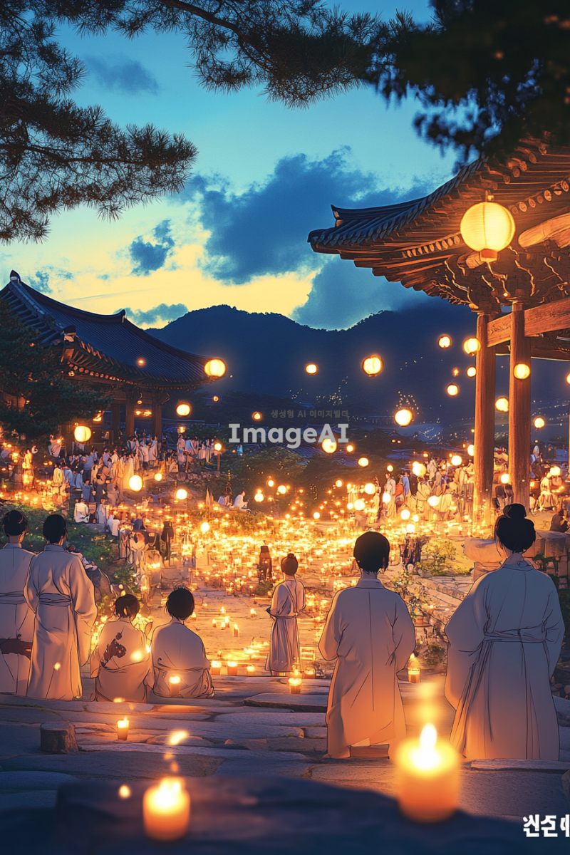 제주도의 아름다운 풍경을 배경으로 현대적인 감각이 느껴지는 민속놀이를 즐기는 캐릭터들이 있는 장면. 5명 이내의 캐릭터가 등장하며, 그 중 일부는 촛불을 들고 있다. 캐릭터들은 뒷모습이나 측면에서 표현되며, 화려한 색감과 빛의 효과가 강조되어 현대적인 느낌을 준다. 민속놀이의 전통적인 요소와 함께 제주도의 독특한 자연 경관이 조화롭게 어우러진 일러스트.