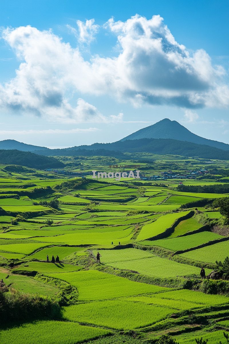 제주도의 푸른 넓은 들판에서 화려한 드론쇼가 펼쳐지는 축제 분위기, 빛을 내 불꽃놀이처럼 아름다운 경관을 보인다, 전통 민속놀이를 즐기는 현대 한국 사람들, 한복 입은 사람 말고 현대의 사람들, 푸른 하늘과 함께 어우러진 풍경, 제주도의 아름다운 자연과 함께하는 즐거운 순간.