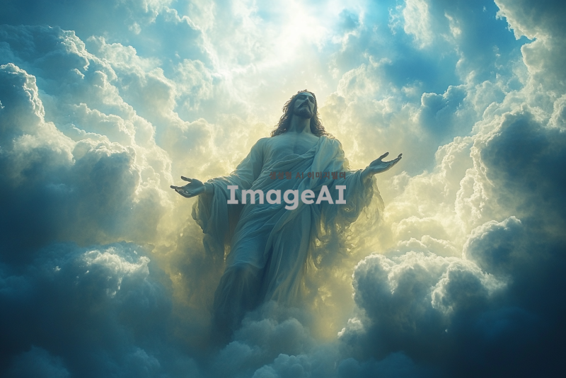 예수님이 구름 속에서 인자한 표정으로 팔을 벌리고 서 있는 모습, 하늘은 푸르고 구름이 부드럽게 흘러가며 빛이 환하게 비추고 있는 장면, 신성한 분위기와 평화로운 느낌을 강조하여 표현.