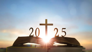 반쯤 펼처진 성경책 위에 나무로 만들어진 2025 장식품이 올라가있으면 좋겠어. 20과 25 사이엔 나무로 된 십자가 장식품이 올라가있으면 좋겠어. 평화로운 분위기를 강조.