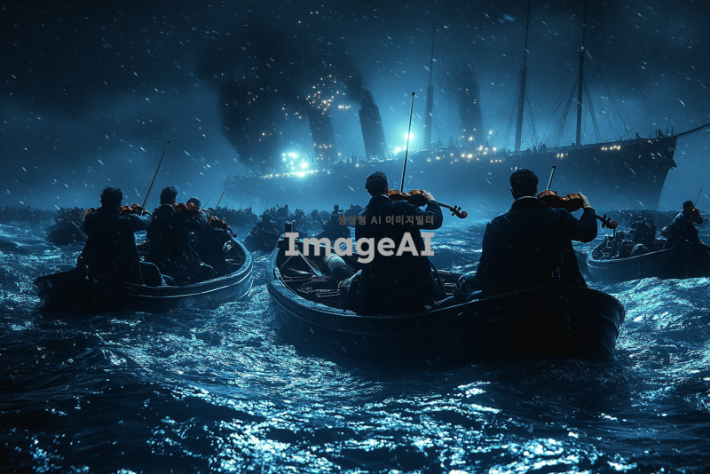 침몰하는 타이타닉호에서 구명정에 타는 사람들을 뒤로하고 열심히 연주하고 있는 4명의 오케스트라 단원들과 1명의 지휘자를 실제 사진처럼 그려줘.