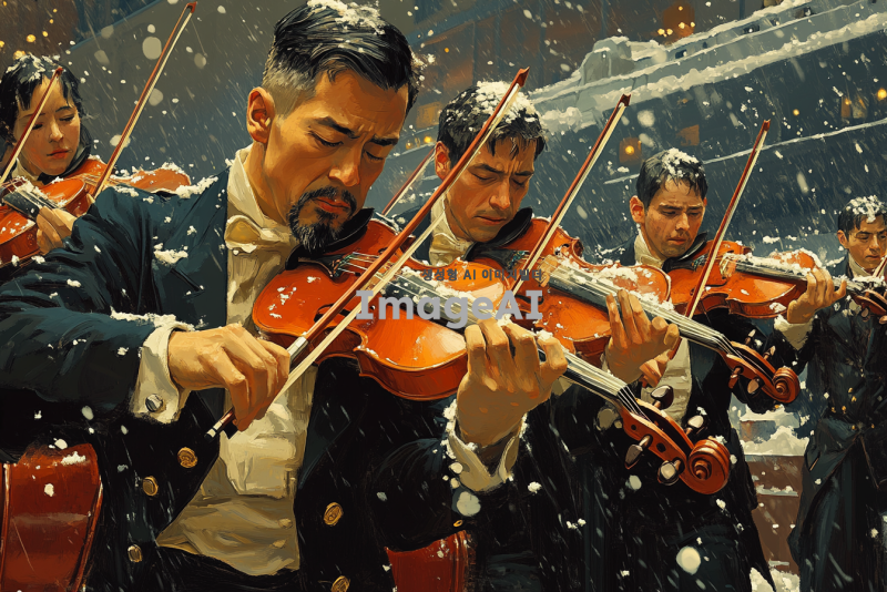 - 오케스트라 단원들 : 바이올린, 첼로, 베이스 등의 악기를 연주하는 4명의 음악가 포함. 정장이나 연마복을 입고 있음