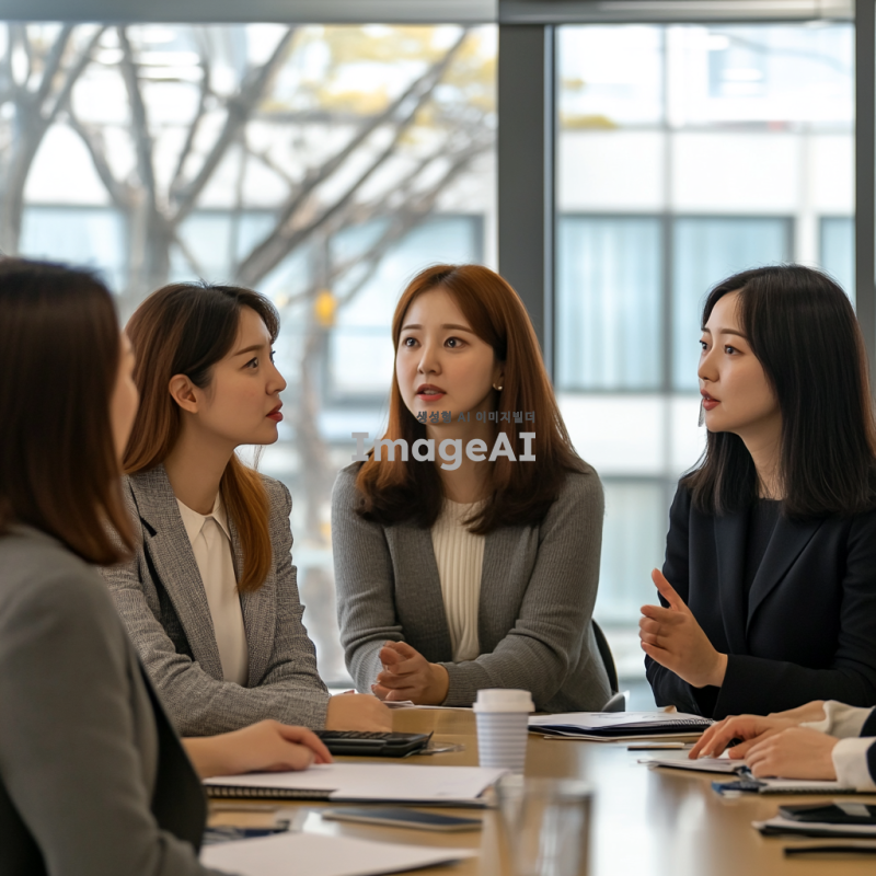 50대 한국인 여성 면접관 5명이 지원자를 보고있는 것. 배경에는 고등학교로 자연광이 들어오는 창문이 있는 공간, 전문적이고 진지한 분위기.