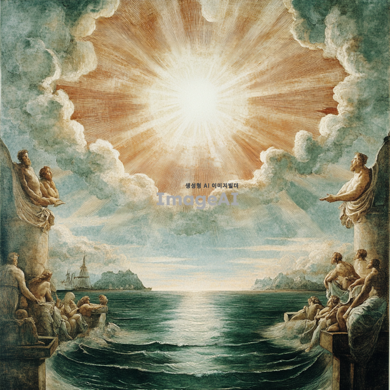 A picture of the creation of the sky. The scene shows the separation of waters, with a clear sky forming above and the seas remaining below, representing the expanse of heaven and earth