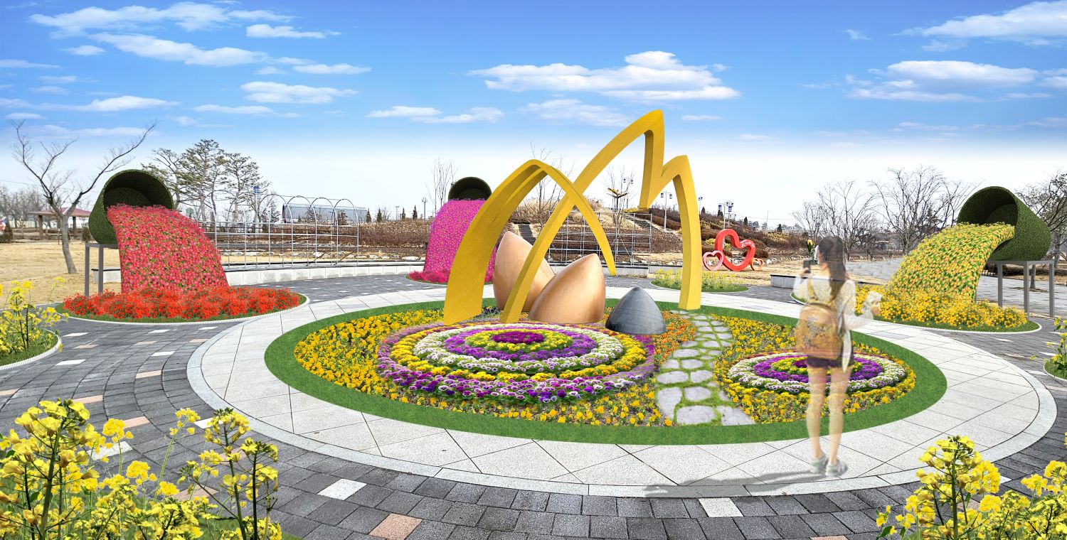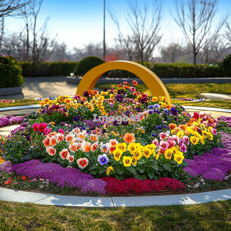 봄꽃 팬지와 비올라로 가득 찬 원형 패턴화단의 아름다운 풍경, 화사한 색감과 다양한 꽃들이 조화롭게 어우러진 모습, 햇살 아래 반짝이는 꽃잎, 자연의 아름다움을 강조한 따뜻한 분위기, 생동감 넘치는 봄의 정취가 느껴지는 장면