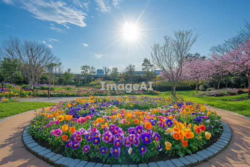 봄꽃 팬지와 비올라로 가득 찬 지름 10m 정도의 원형 화단의 모습. 화사한 색상의 팬지와 비올라가 조화롭게 어우러져 있는 풍경, 햇살이 비치는 따뜻한 봄날의 분위기. 화단 주변에는 푸른 잔디와 작은 돌길이 둘러싸여 있으며, 배경에는 흐드러진 벚꽃나무가 보인다. 전체적으로 생동감 넘치고 화려한 봄의 정취가 느껴지는 장면.