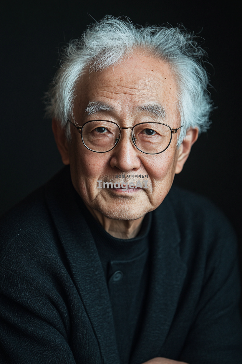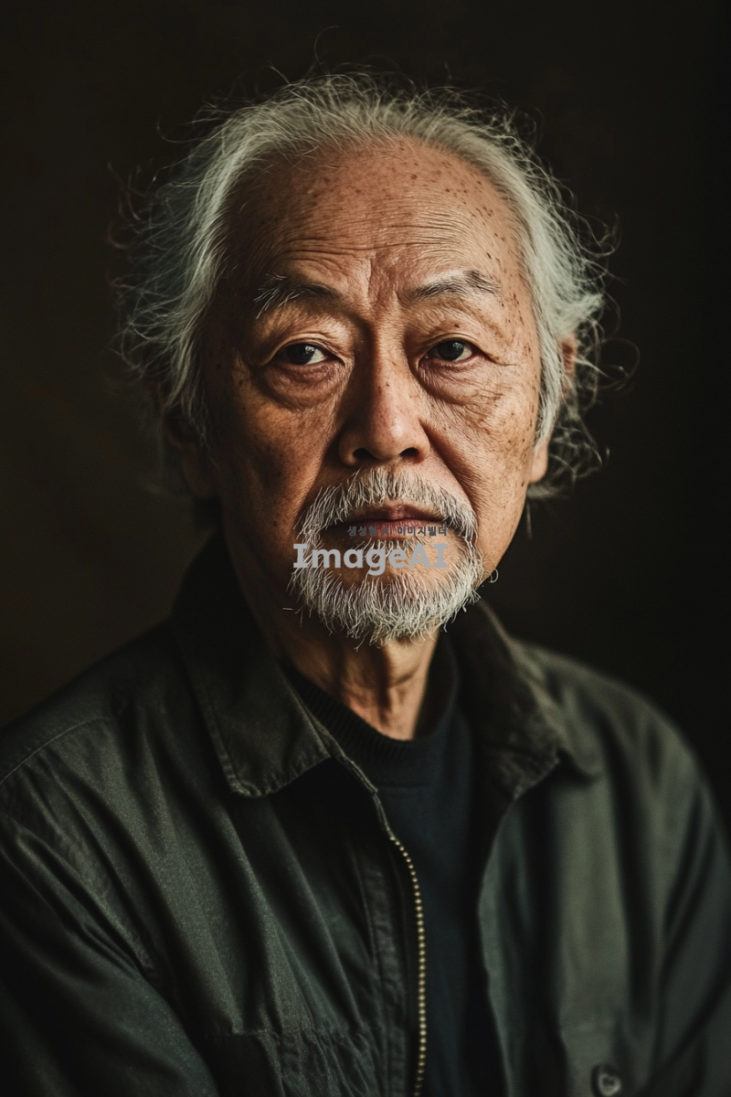 스튜디오에서 촬영한 노인의 독사진. 은은한 조명아래서 찍힌사진. 한국적인 사진.