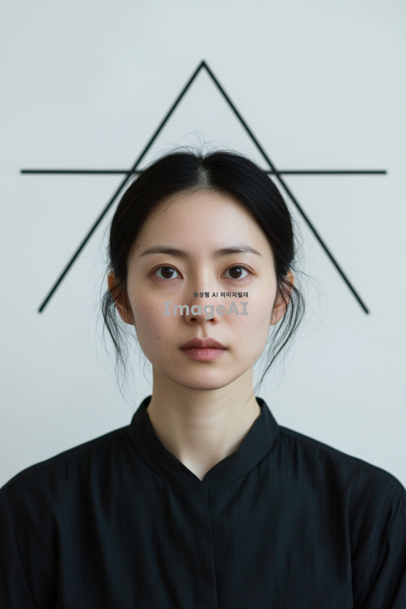 A photo of an Asian woman in her late thirtie. She has black hair tied back to her shoulders. The background is a plain white. Her face looks straight ahead, with no shadows on it. In front of her stands a simple geometric figure of one triangle above another, with the two triangles standing opposite each other.