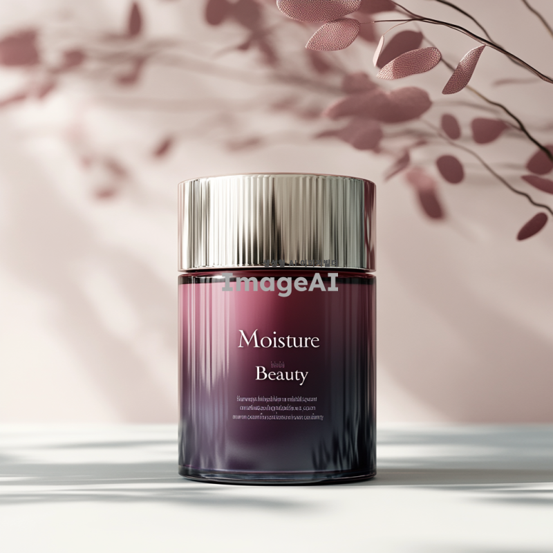 화장품 용기에 "수분미인"이라는 로고가 디자인된 모습, 세련되고 현대적인 느낌의 패키지, 부드러운 곡선과 자연을 연상시키는 색상 조합, 고급스러운 텍스처와 함께 로고가 돋보이도록 배치된 이미지, 배경은 깨끗하고 심플한 느낌으로, 수분과 자연의 이미지를 강조한 요소들 추가.