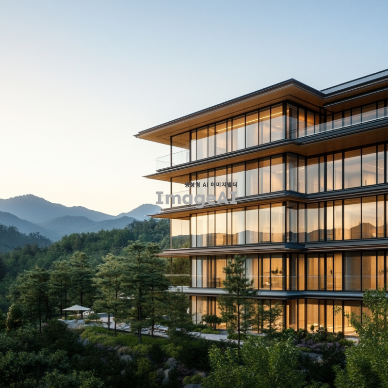 산 속에 위치한 10층 건물, 자연과 조화를 이루는 현대적인 디자인, 주변의 푸른 나무들과 맑은 하늘, 건물의 유리창에서 반사되는 산의 경치, 따뜻한 햇살이 비치는 풍경, 평화롭고 고요한 분위기.
