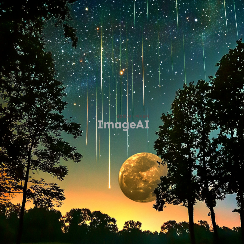 어두운 밤하늘에 빛나는 커다란 달이 떠 있고, 그 주변으로 여러 개의 유성이 떨어지는 장면. 유성이 하늘을 가로지르며 반짝이고, 달빛이 주변을 은은하게 비추는 모습. 배경에는 별들이 가득한 우주가 펼쳐져 있고, 고요한 자연 풍경이 어우러져 신비로운 분위기를 자아내는 이미지.