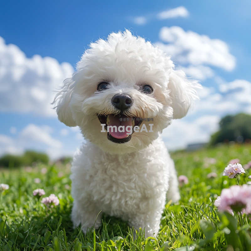 행복하게 놀고 있는 비숑 프리제, 푸른 잔디밭 위에서 해맑게 웃고 있는 모습, 햇살이 비치는 따뜻한 날씨, 주변에는 꽃들이 만발해 있고, 배경에는 푸른 하늘과 흰 구름이 떠 있는 풍경, 귀여운 표정과 털이 풍성한 모습, 사랑스러운 분위기.