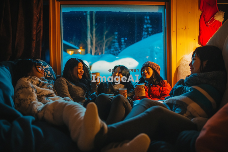한국인 여성 5명이 핀란드 사리셀카의 이글루호텔에 누워 코코아를 마시며 창 밖의 오로라를 감상하는 모습. 따뜻한 느낌의 실내에서 아늑한 분위기를 연출하고, 오로라의 화려한 색상이 창을 통해 비치는 장면을 담아내며, 여성들은 편안한 복장으로 서로 이야기를 나누고 있는 모습.