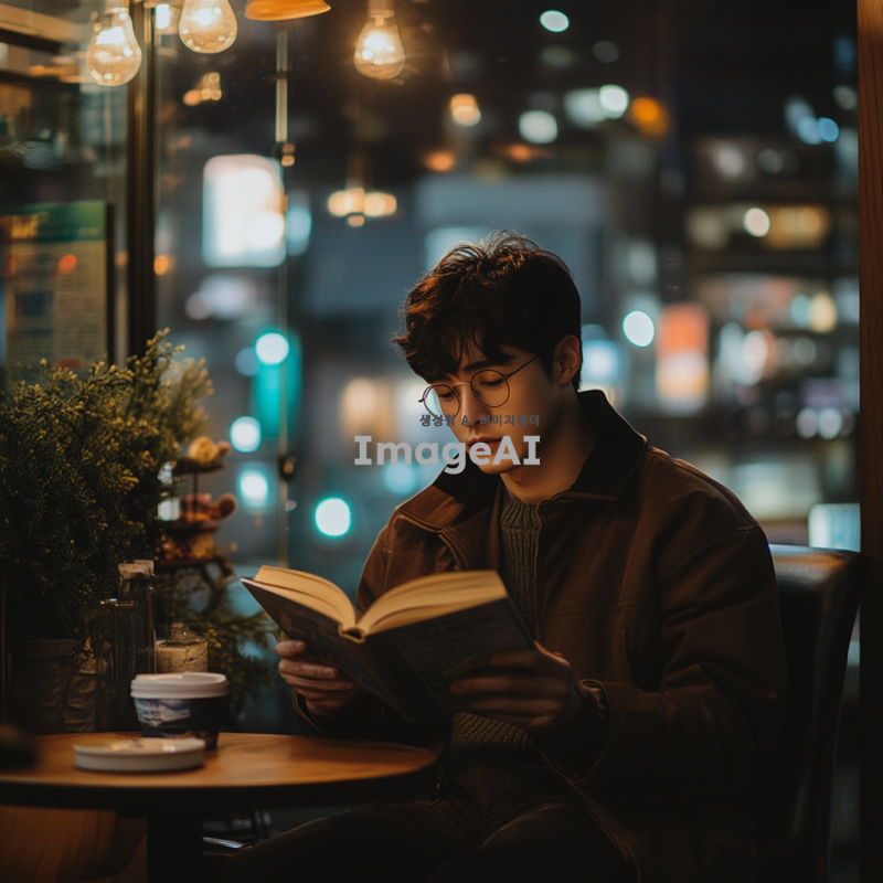 한국 남성이 도심의 카페에서 책을 읽고 있는 모습, 따뜻한 조명이 비추는 아늑한 분위기, 창밖으로 보이는 도시 풍경, 편안한 복장과 집중한 표정, 커피 잔이 옆에 놓여 있는 장면.