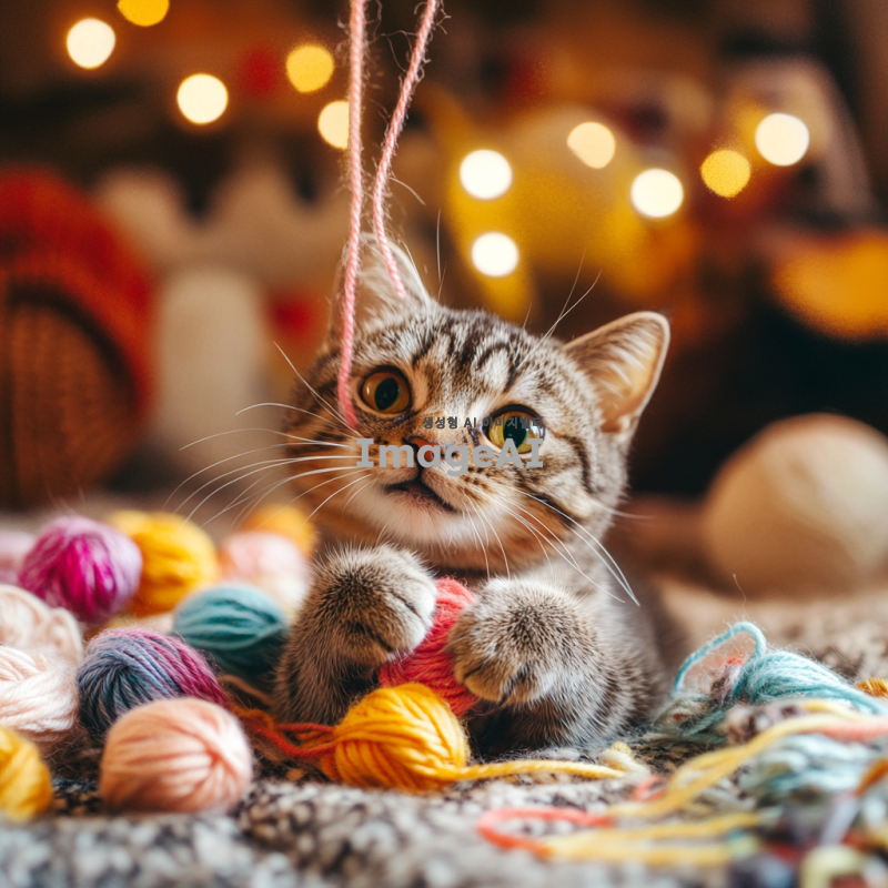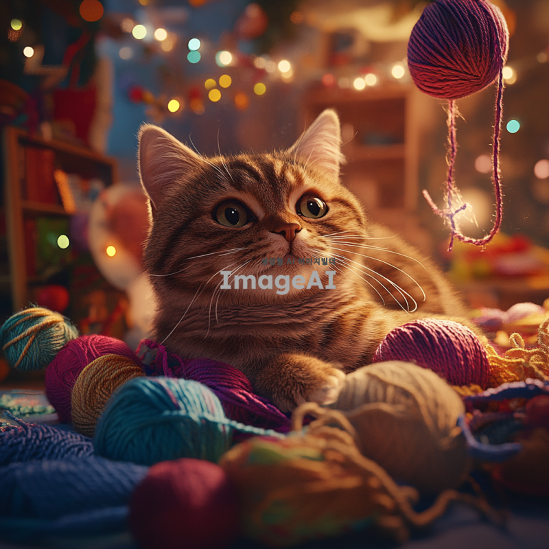 고양이가 다양한 색상의 털실을 가지고 즐겁게 노는 모습, 밝은 조명 아래에서 털실이 흩어져 있는 방 안, 고양이의 귀여운 표정과 장난스러운 자세, 주변에 놓인 장난감과 따뜻한 분위기.