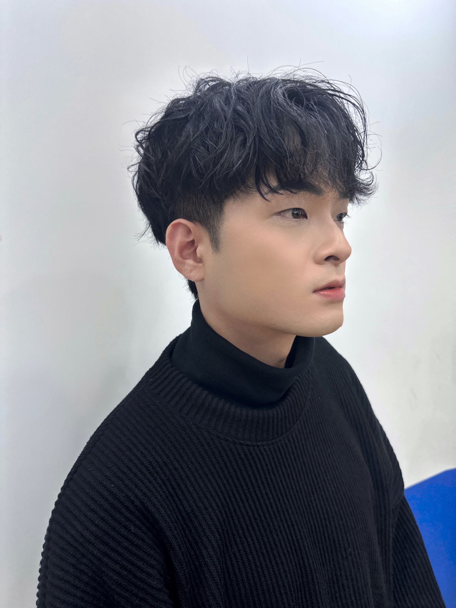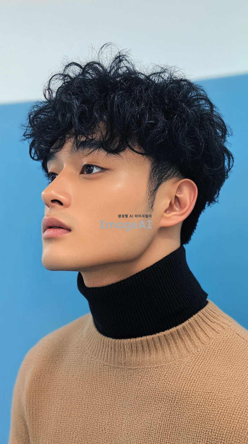 잘생긴 남자가 검은 곱슬머리를 하고 옆모습으로 촬영되었으며, 파란 배경에 카키색 하이넥 스웨터를 입고 있습니다. 그는 밝은 피부 톤과 자연스럽고 자신감 있는 표정을 가지고 있습니다. 그의 디테일은 섬세한 질감을 가지고 있으며, 색상은 신선하고 생동감 있습니다.