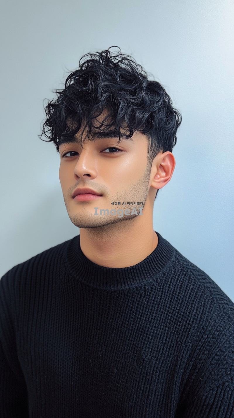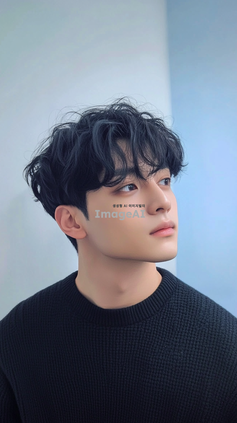 잘생긴 남자가 검은 머리를 가지고 있으며, 전체가 검은 스웨터를 입고 흰색 배경에 반신 프로필 사진을 찍었습니다. 그는 평평하고 짧은 곱슬머리 스타일에 약간 헝클어진 앞머리와 어깨 길이의 검은 머리를 가지고 있습니다. 배경은 파란 벽과 연한 회색의 단색 배경으로, 부드러운 조명과 선명한 디테일이 있는 미니멀한 구성을 만듭니다. 그의 자연스러운 피부 톤과 자신감 있는 미소가 이미지를 완성합니다.