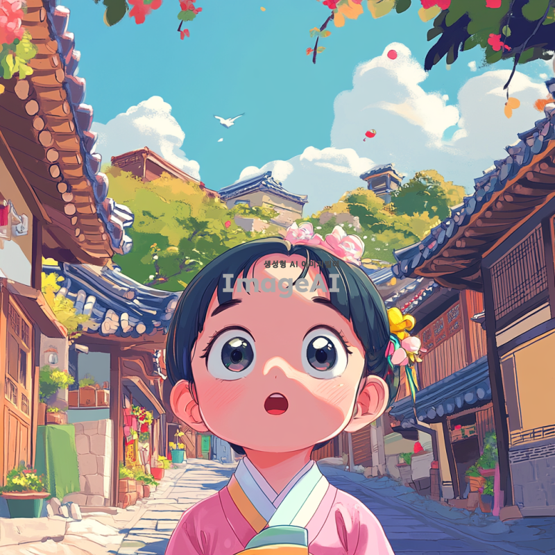 한국의 전통적인 분위기에서 딱밤을 맞고 있는 귀여운 캐릭터, 밝은 표정과 함께 놀란 눈을 가진 모습, 주변에 만화적인 효과와 함께 경쾌한 색감, 배경은 한국의 전통 가옥이나 공원 풍경, 캐릭터는 귀여운 스타일로, 동물이나 판타지 요소를 추가하여 재미있고 유머러스한 느낌을 강조.