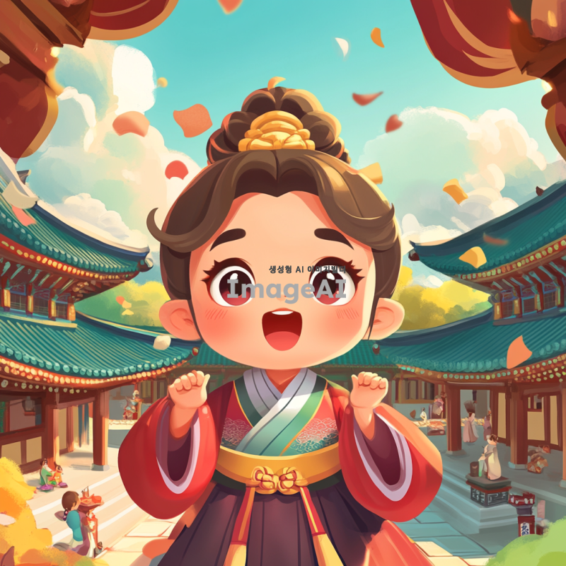 한국의 전통적인 분위기에서 딱밤을 때리고 있는 귀여운 캐릭터, 장난기 가득한 표정과 함께 놀란 눈빛을 표현, 배경은 화사한 색감의 만화 스타일로, 캐릭터는 한국의 전통 의상을 입고 있으며, 유머러스한 상황을 강조하는 요소들로 가득한 장면.