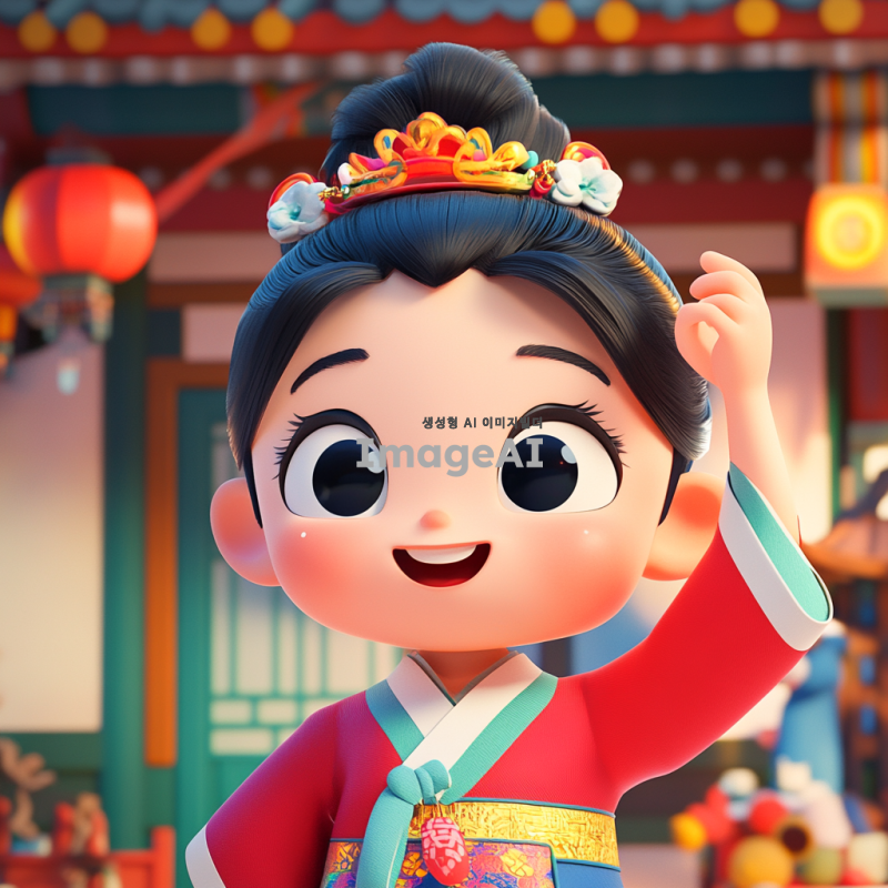한국의 전통 의상을 입고 있는 귀여운 캐릭터가 장난스럽게 다른 캐릭터의 머리를 딱밤 때리는 모습. 배경은 화사한 색감의 만화 스타일로, 즐거운 분위기를 강조. 캐릭터의 표정은 유쾌하고 장난기 가득하며, 주변에는 다양한 재미있는 소품들이 배치되어 있어 생동감을 더함.