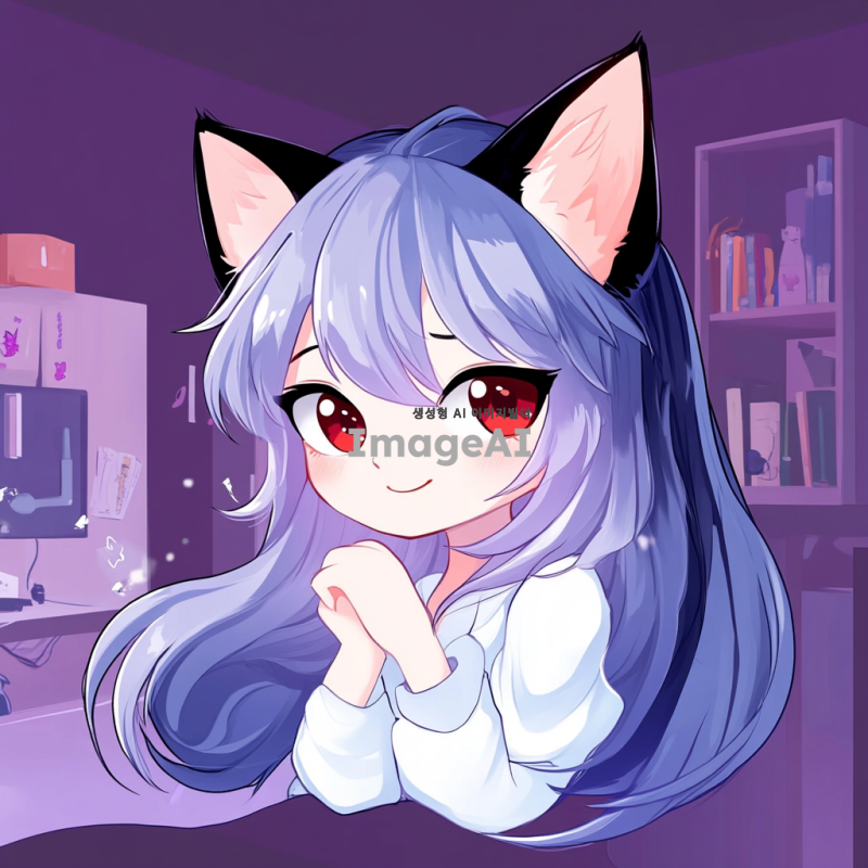 귀여운 여우 캐릭터, 연보라색 머리카락을 가진, 밝고 장난꾸러운 표정, 적안, 만화 스타일